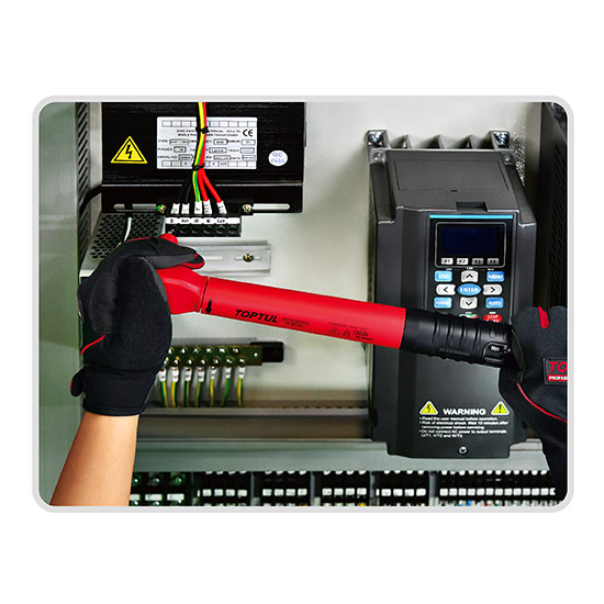 ITEM NO: ANVA1205V4 Electrical insulation protection up to AC 1000V and DC 1500V Robust chrome molybdenum alloy steel square drive 45 teeth ratchet mechanism Only for controlled tightening in a clockwise direction Easy to read dual scale graduated in both Nm and Ft-Lb Unique spring design for long tool life and repeatability Click system triggers a tactile and audible signal when the required torque is reached Easy and accurate torque setting through adjustment knob at the end of the handle Tolerance of torque accuracy ±4% CW Torque calibration is tested and certified according to DIN EN ISO 6789 Insulation meets VDE and international standard DIN EN/IEC 60900 Each torque wrench comes with unique serial number and calibration certificate